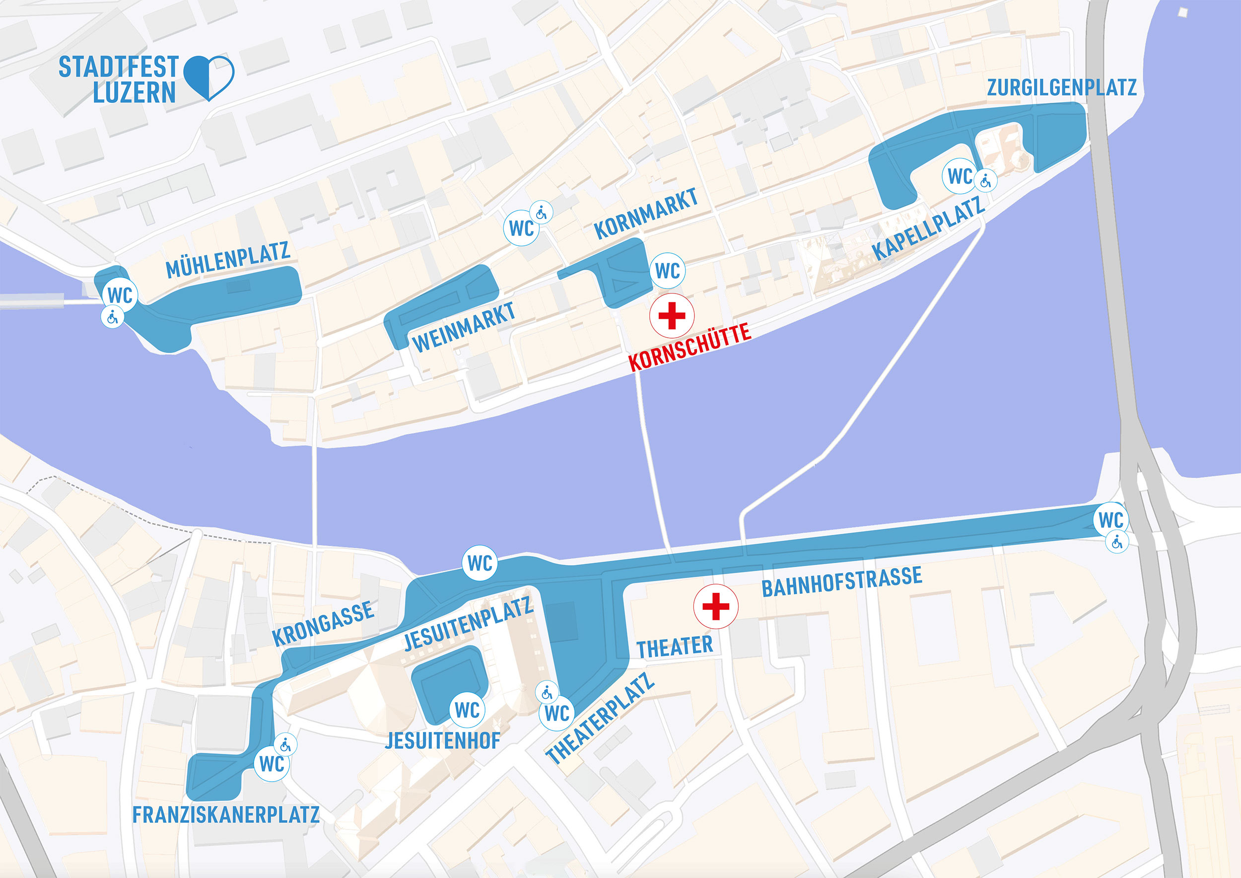 Der Festperimeter vom Stadtfest Luzern ist grundsätzlich rollstuhlgängig. Hindernisfreie Toiletten sind auf dem Stituationsplan ersichtlich. Der Zugang zur MLG-Bar und zum Wasserturm ist nicht barrierefrei. Bei Fragen und Anliegen könnt ihr euch gerne bei uns per Mail an